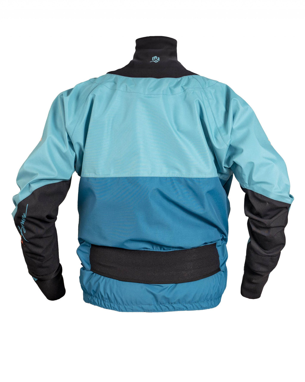 Wie für Trockenjacken üblich, hat auch diese Jacke Latexmanschetten an Armen und Hals. Darüber hat die Jacke außerdem noch eine Manschette aus Neopren. Das Neopren schützt nicht nur das Latex vor UV-Strahlung, sondern wärmt auch die Handgelenke und Unterarme. Die Ärmel der Jacke sind relativ schmal geschnitten, was ganz fein ist, weil sich nicht so viel Material an den Armen bauscht. An den stärker beanspruchten Stellen am Unterarm und den Ellbogen hat die Jacke Einsätze aus abrieb- und reißfestem CORDURA®.